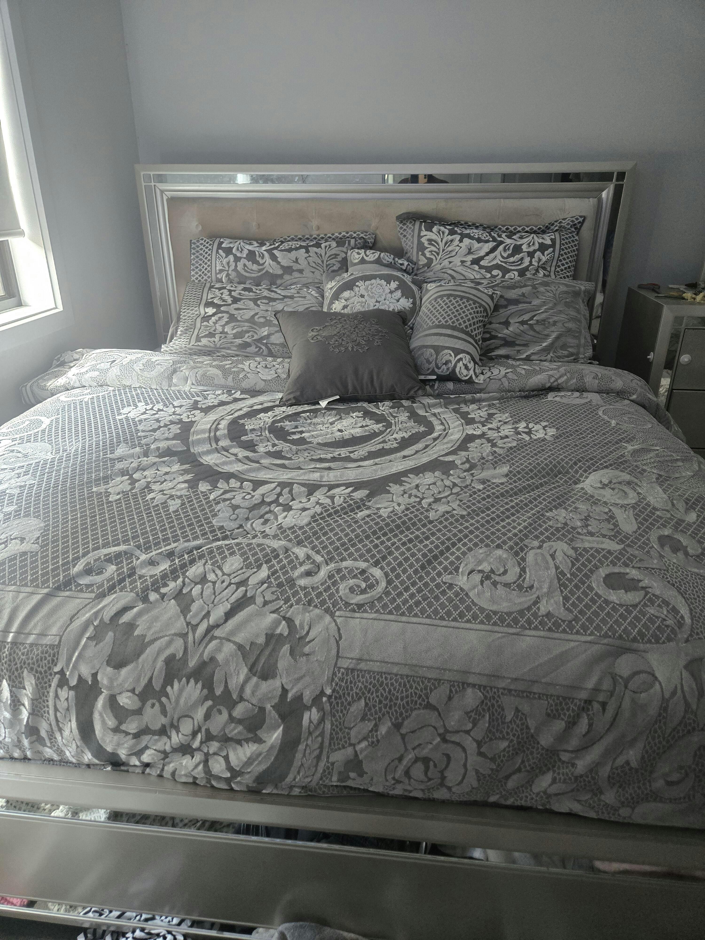 The 10 Pcs Luxury Gift Bedding Set in grey with a silver medallion pattern adds comfort and style to any bedroom. Soft, durable, and elegant, it includes matching pieces for a complete, cozy, and thoughtful gift-ready set.